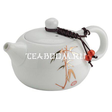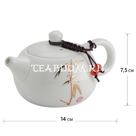 Керамический чайник слегка приплюснутой овальной формы, с коротким мягко изогнутым носиком и С-образной ручкой. Крышка дополнена ручкой-шариком. Чайник украшен изображением бамбука.