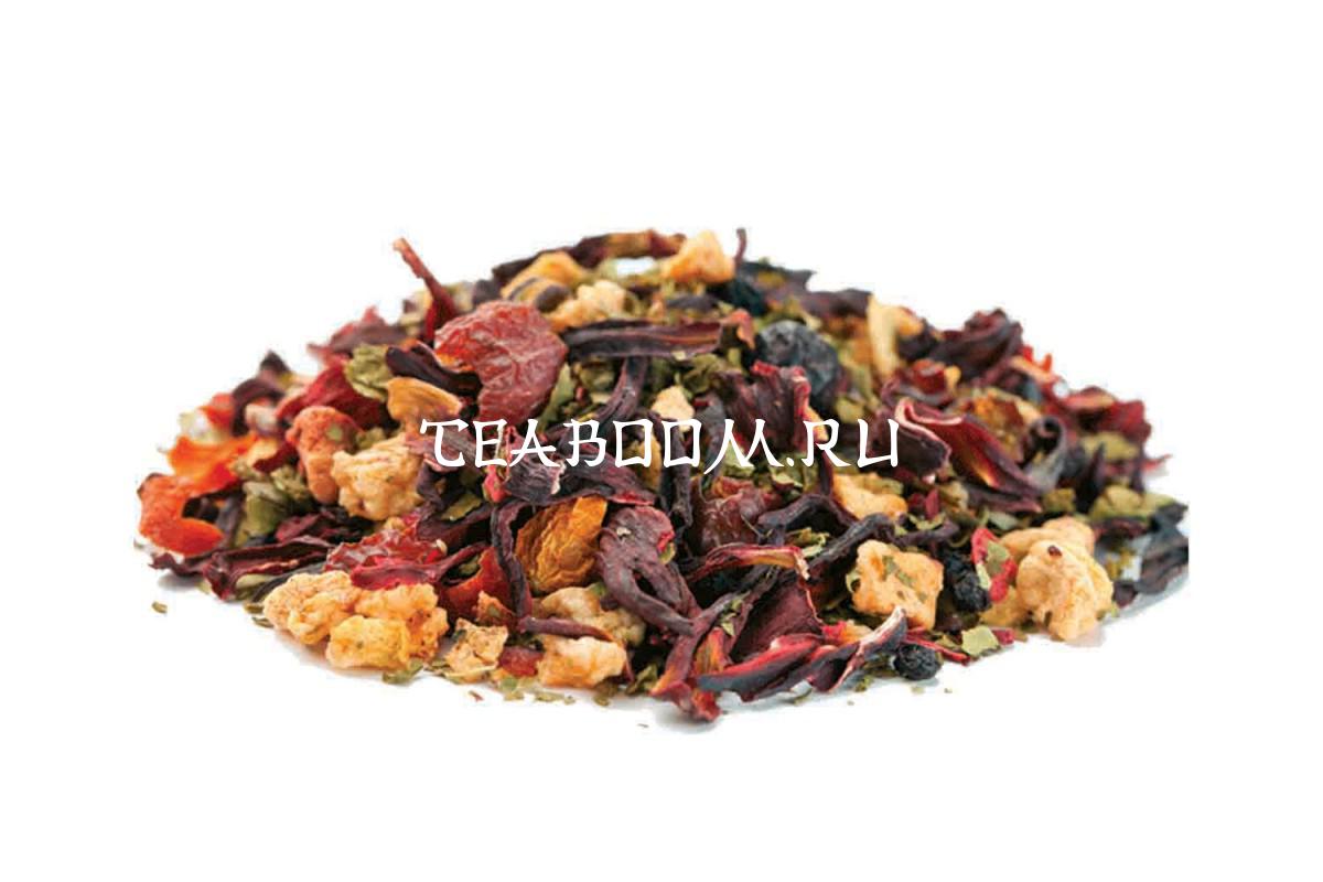 Гибискус в сочетании с кусочками шиповника и яблок, листьями и ягодами ежевики, садовой бузины и черной смородины, гранулированной малины с волшебным малиновым ароматом - полная корзина лесных и садовых вкусов.