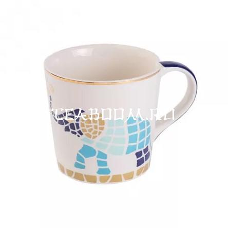 Фарфоровая кружка из коллекции "Слон", объем 400 мл. Коллекция чайной фарфоровой посуды "Слон" выполнена в стиле "мозайка" в красивых синем, голубом и золотом цветах. У слона поднят хобот, а значит, по даосской практике "Фэншуй" счастливому владельцу будет сопутствовать удача, уверенность в своих силах и благополучие. Из-за нанесения золота коллекцию "Слон" нельзя мыть в посудомоечной машине и разогревать в микроволновой печи.