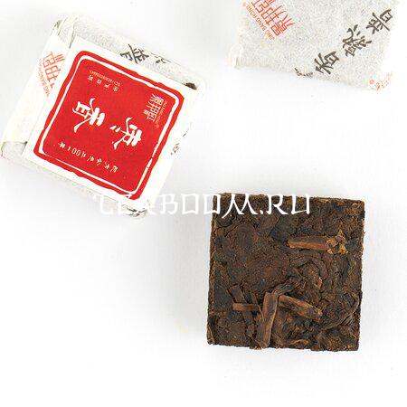 Шу пуэр, спрессованный в кирпичики по 6 г. Аромат сухого листа наполнен древесными и ореховыми оттенками.