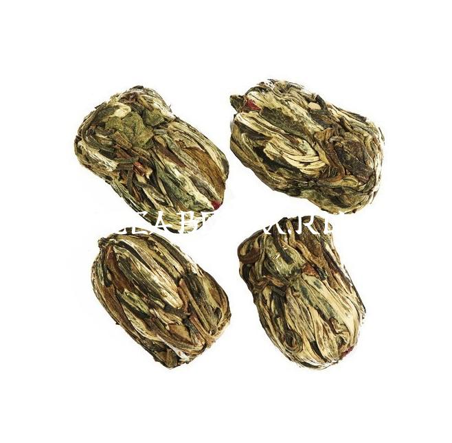 Связанный чай из провинции Юнньнань. Нежные молодые листочки зелёного чая, ароматизированные натуральным жасмином, связывают вручную вместе с цветком китайской гвоздики, придавая им форму финика. При заваривании чай раскрывается махровым цветком хризантемы.
